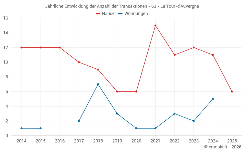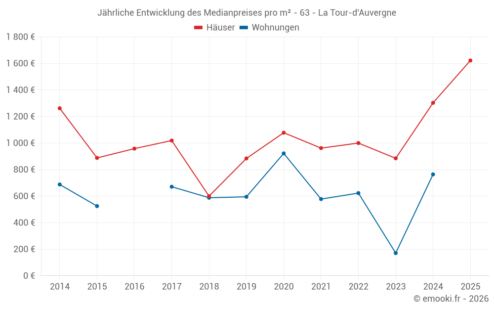 Der Durchschnittspreis auf den 23 Hausgeschäften der letzten 24 Monate in der Gemeinde La Tour-d'Auvergne betrug 1 344 € pro Quadratmeter für einen mittleren Immobilienwert von 95 000 €. Über diesen Zeitraum hinweg lagen 60% der Transaktionen zwischen 829 und 1 830 € pro Quadratmeter (vom 2. bis zum 8. Dezil).