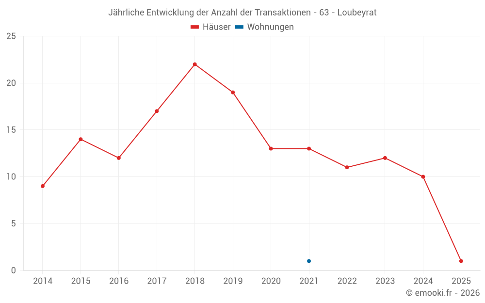 Der Durchschnittspreis auf den 18 Hausgeschäften der letzten 24 Monate in der Gemeinde Loubeyrat betrug 2 083 € pro Quadratmeter für einen mittleren Immobilienwert von 233 150 €. Über diesen Zeitraum hinweg lagen 60% der Transaktionen zwischen 1 742 und 2 816 € pro Quadratmeter (vom 2. bis zum 8. Dezil).