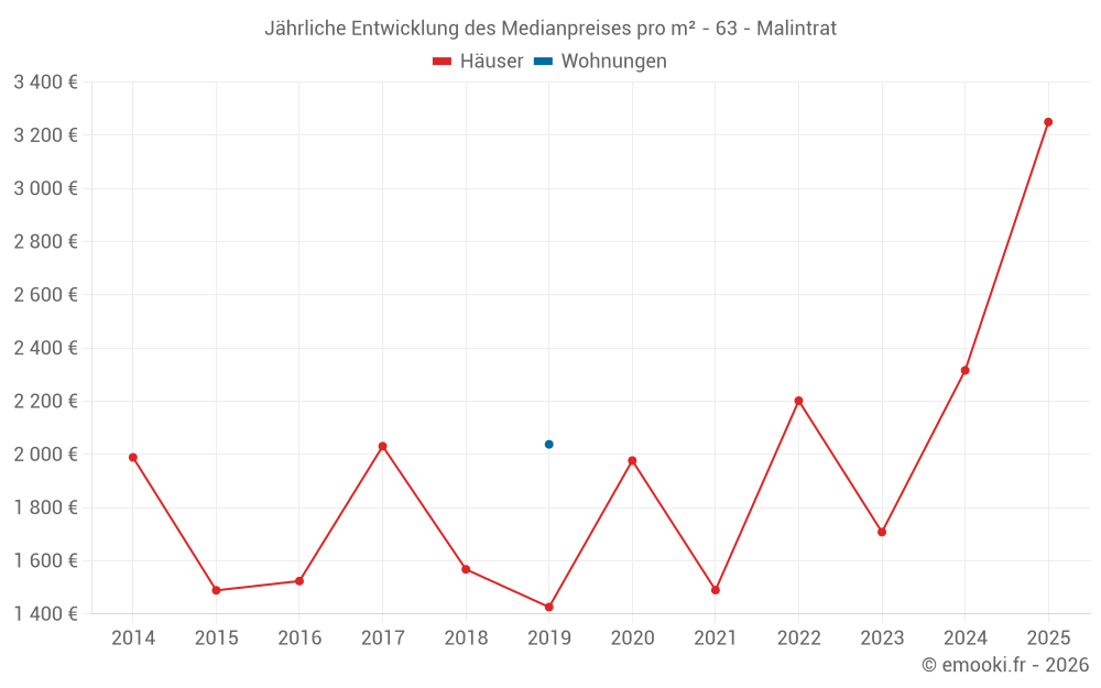 Der Durchschnittspreis auf den 17 Hausgeschäften der letzten 24 Monate in der Gemeinde Malintrat betrug 2 316 € pro Quadratmeter für einen mittleren Immobilienwert von 240 000 €. Über diesen Zeitraum hinweg lagen 60% der Transaktionen zwischen 1 632 und 2 776 € pro Quadratmeter (vom 2. bis zum 8. Dezil).
