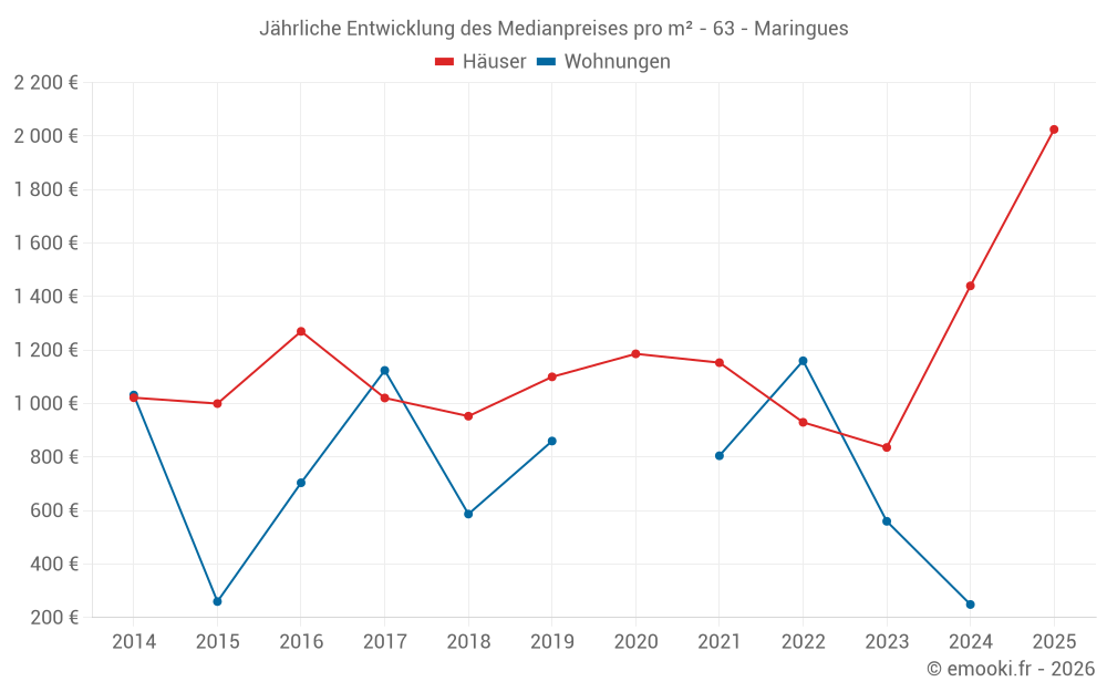 Der Durchschnittspreis auf den 26 Hausgeschäften der letzten 12 Monate in der Gemeinde Maringues betrug 1 481 € pro Quadratmeter für einen mittleren Immobilienwert von 139 712 €. Über diesen Zeitraum hinweg lagen 60% der Transaktionen zwischen 515 und 2 355 € pro Quadratmeter (vom 2. bis zum 8. Dezil).