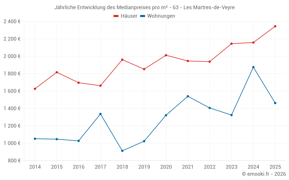 Der Durchschnittspreis auf den 18 Hausgeschäften der letzten 6 Monate in der Gemeinde Les Martres-de-Veyre betrug 2 457 € pro Quadratmeter für einen mittleren Immobilienwert von 249 284 €. Über diesen Zeitraum hinweg lagen 60% der Transaktionen zwischen 1 346 und 2 945 € pro Quadratmeter (vom 2. bis zum 8. Dezil).