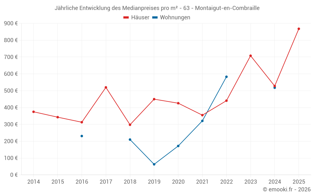Der Durchschnittspreis auf den 21 Hausgeschäften der letzten 24 Monate in der Gemeinde Montaigut-en-Combraille betrug 596 € pro Quadratmeter für einen mittleren Immobilienwert von 64 000 €. Über diesen Zeitraum hinweg lagen 60% der Transaktionen zwischen 423 und 1 118 € pro Quadratmeter (vom 2. bis zum 8. Dezil).