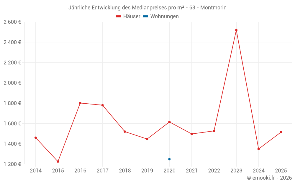 Der Durchschnittspreis auf den 15 Hausgeschäften der letzten 24 Monate in der Gemeinde Montmorin betrug 1 542 € pro Quadratmeter für einen mittleren Immobilienwert von 165 000 €. Über diesen Zeitraum hinweg lagen 60% der Transaktionen zwischen 1 141 und 2 325 € pro Quadratmeter (vom 2. bis zum 8. Dezil).