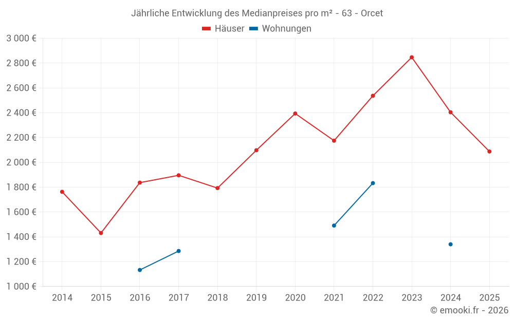 Der Durchschnittspreis auf den 32 Hausgeschäften der letzten 12 Monate in der Gemeinde Orcet betrug 2 134 € pro Quadratmeter für einen mittleren Immobilienwert von 219 100 €. Über diesen Zeitraum hinweg lagen 60% der Transaktionen zwischen 1 564 und 2 665 € pro Quadratmeter (vom 2. bis zum 8. Dezil).