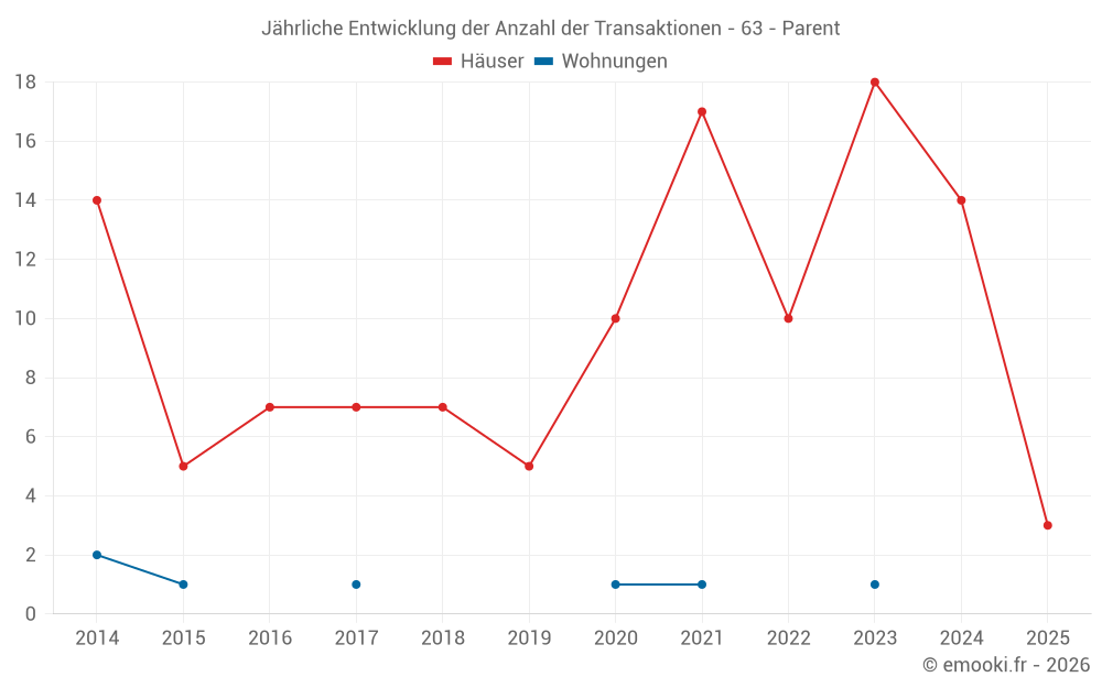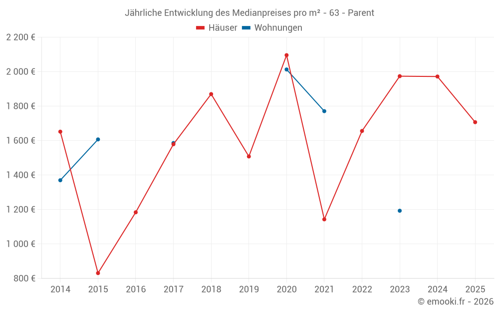Der Durchschnittspreis auf den 26 Hausgeschäften der letzten 24 Monate in der Gemeinde Parent betrug 1 858 € pro Quadratmeter für einen mittleren Immobilienwert von 146 500 €. Über diesen Zeitraum hinweg lagen 60% der Transaktionen zwischen 1 318 und 2 630 € pro Quadratmeter (vom 2. bis zum 8. Dezil).