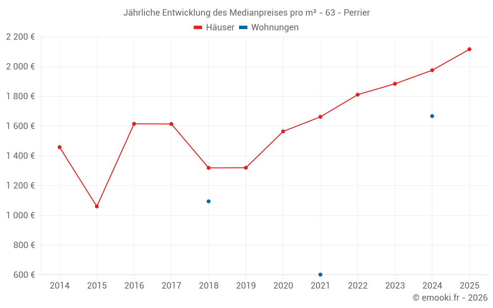 Der Durchschnittspreis auf den 27 Hausgeschäften der letzten 24 Monate in der Gemeinde Perrier betrug 1 966 € pro Quadratmeter für einen mittleren Immobilienwert von 185 000 €. Über diesen Zeitraum hinweg lagen 60% der Transaktionen zwischen 1 461 und 2 375 € pro Quadratmeter (vom 2. bis zum 8. Dezil).