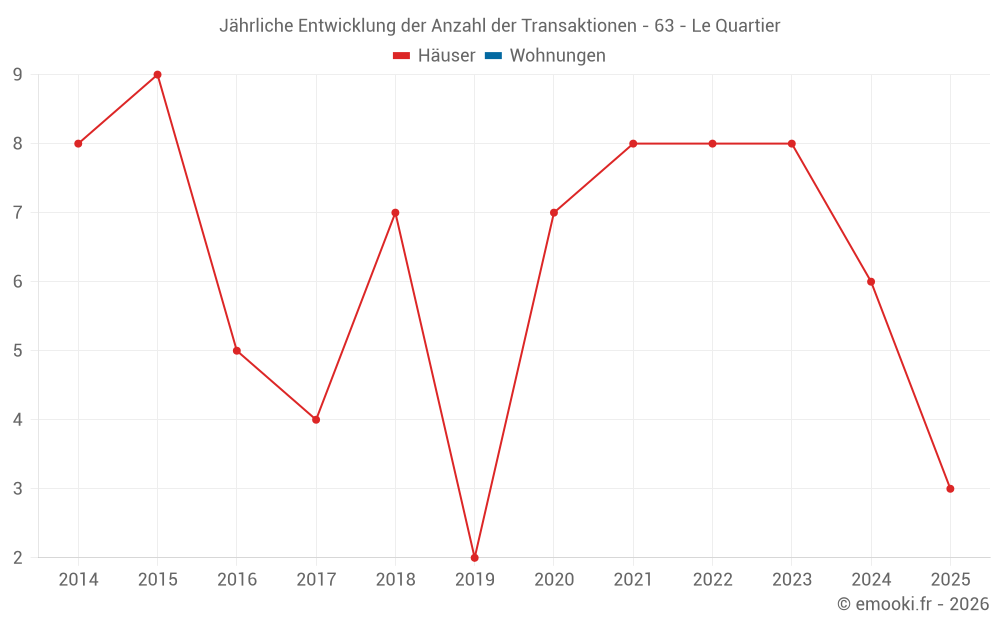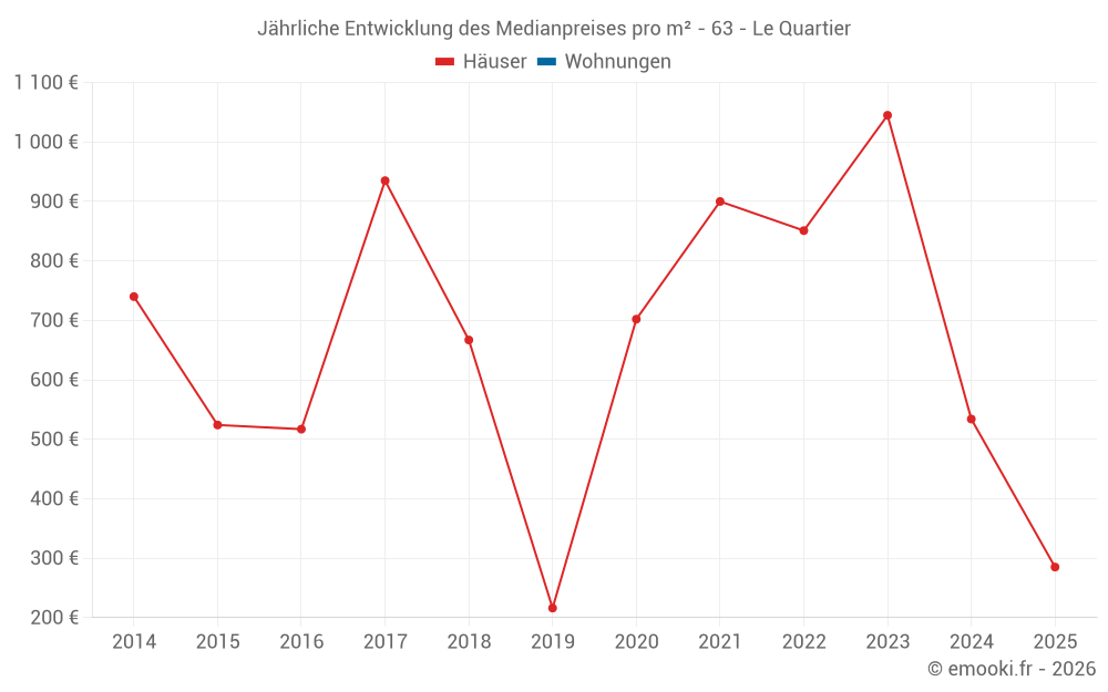Der Durchschnittspreis auf den 14 Hausgeschäften der letzten 24 Monate in der Gemeinde Le Quartier betrug 679 € pro Quadratmeter für einen mittleren Immobilienwert von 57 500 €. Über diesen Zeitraum hinweg lagen 60% der Transaktionen zwischen 361 und 1 403 € pro Quadratmeter (vom 2. bis zum 8. Dezil).