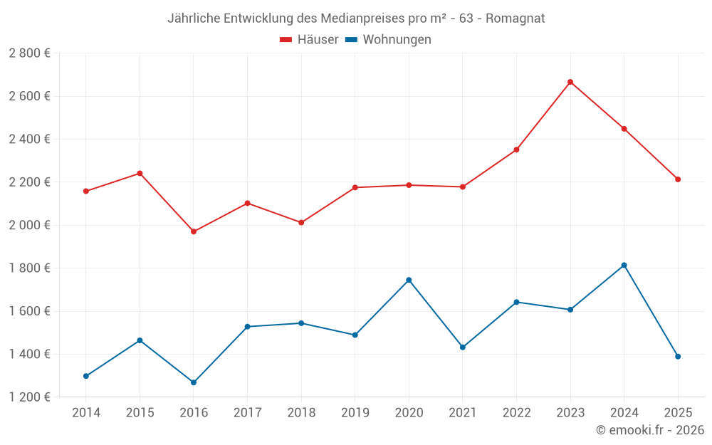 Der Durchschnittspreis auf den 19 Wohnungstransaktionen der letzten 12 Monate in der Gemeinde Romagnat betrug 1 787 € pro Quadratmeter für einen mittleren Immobilienwert von 145 000 €. Über diesen Zeitraum hinweg lagen 60% der Transaktionen zwischen 1 383 und 2 242 € pro Quadratmeter (vom 2. bis zum 8. Dezil).