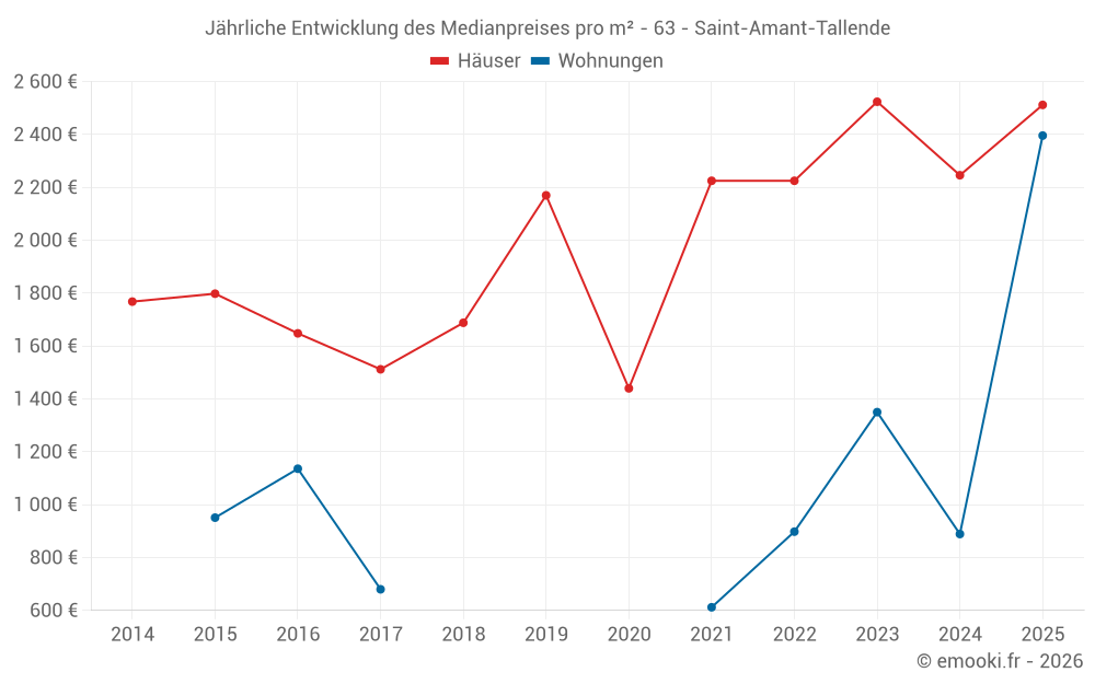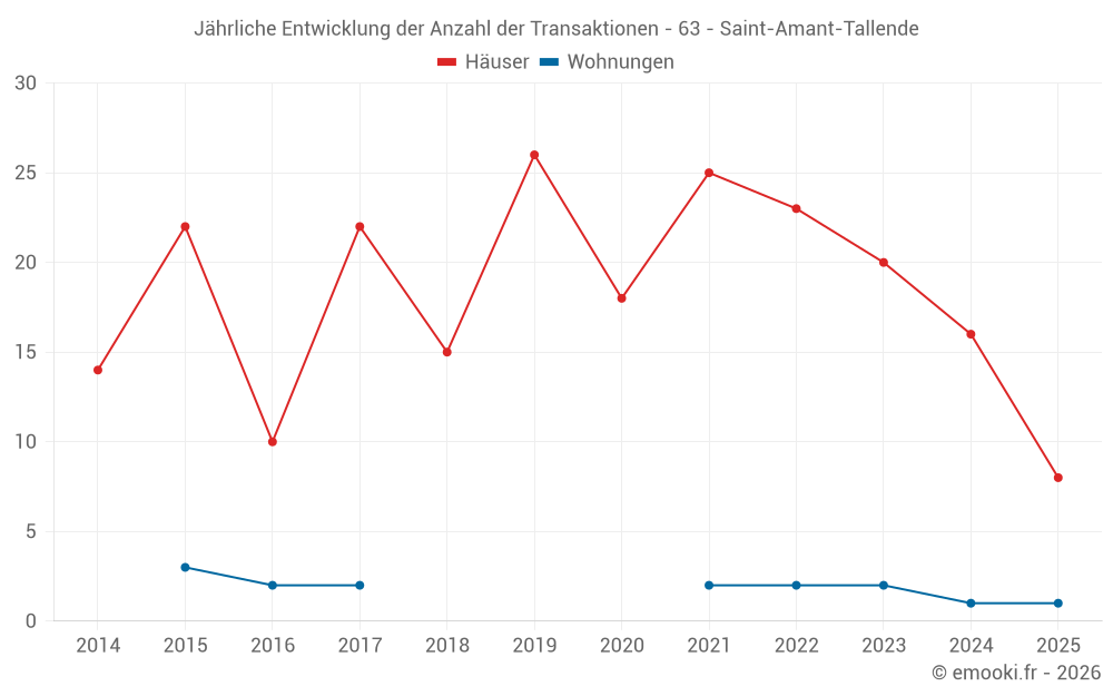 Der Durchschnittspreis auf den 16 Hausgeschäften der letzten 12 Monate in der Gemeinde Saint-Amant-Tallende betrug 2 314 € pro Quadratmeter für einen mittleren Immobilienwert von 242 250 €. Über diesen Zeitraum hinweg lagen 60% der Transaktionen zwischen 1 003 und 2 753 € pro Quadratmeter (vom 2. bis zum 8. Dezil).