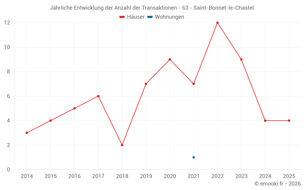 Der Durchschnittspreis auf den 14 Hausgeschäften der letzten 24 Monate in der Gemeinde Saint-Bonnet-le-Chastel betrug 728 € pro Quadratmeter für einen mittleren Immobilienwert von 61 720 €. Über diesen Zeitraum hinweg lagen 60% der Transaktionen zwischen 311 und 1 593 € pro Quadratmeter (vom 2. bis zum 8. Dezil).