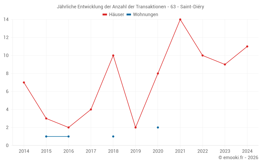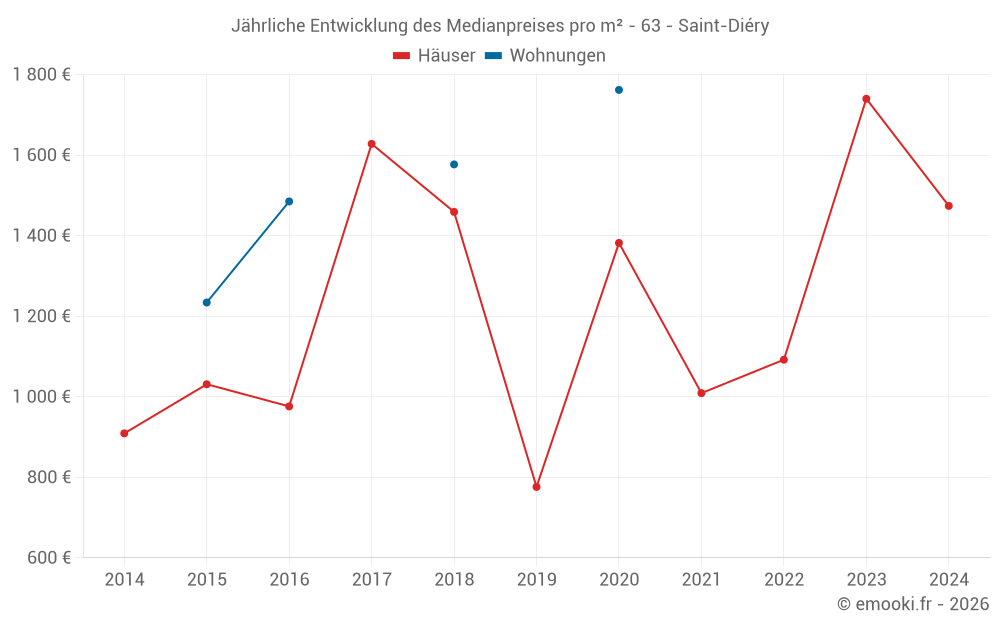 Der Durchschnittspreis auf den 15 Hausgeschäften der letzten 24 Monate in der Gemeinde Saint-Diéry betrug 1 593 € pro Quadratmeter für einen mittleren Immobilienwert von 137 000 €. Über diesen Zeitraum hinweg lagen 60% der Transaktionen zwischen 1 283 und 2 195 € pro Quadratmeter (vom 2. bis zum 8. Dezil).