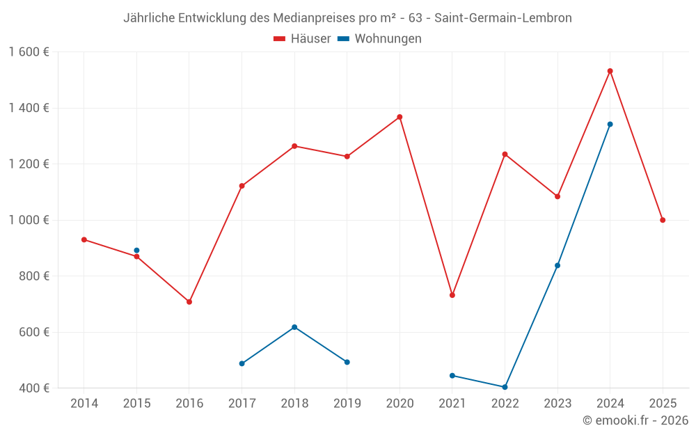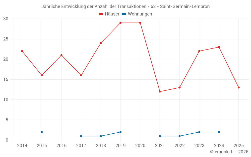 Der Durchschnittspreis auf den 24 Hausgeschäften der letzten 12 Monate in der Gemeinde Saint-Germain-Lembron betrug 1 041 € pro Quadratmeter für einen mittleren Immobilienwert von 136 675 €. Über diesen Zeitraum hinweg lagen 60% der Transaktionen zwischen 685 und 1 940 € pro Quadratmeter (vom 2. bis zum 8. Dezil).