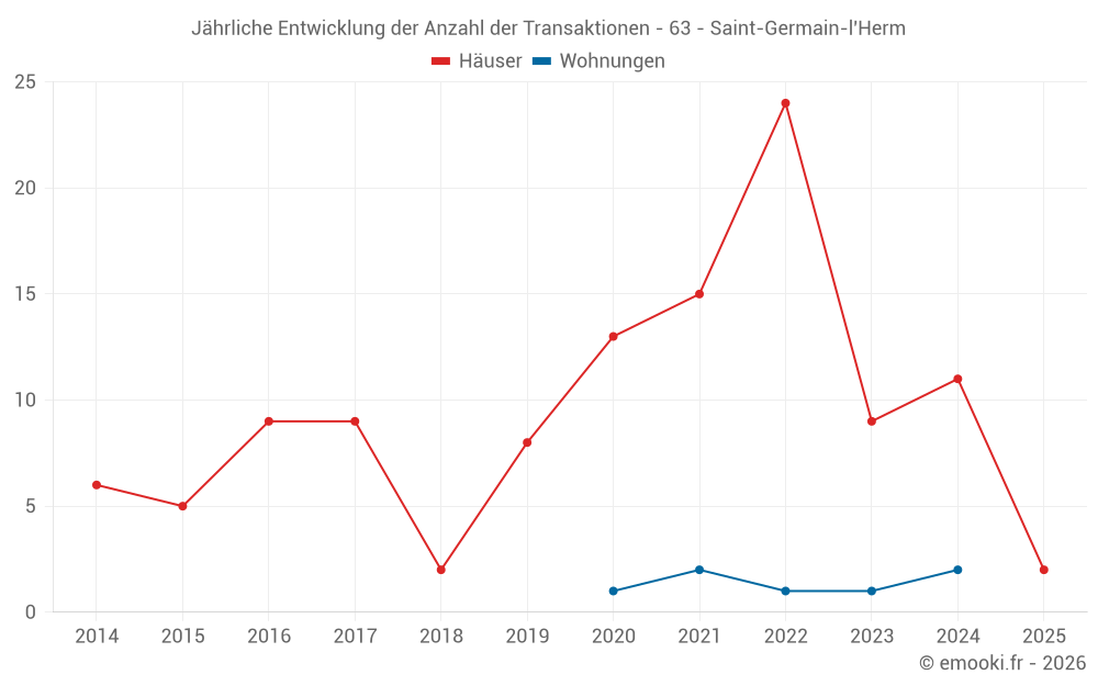 Der Durchschnittspreis auf den 15 Hausgeschäften der letzten 24 Monate in der Gemeinde Saint-Germain-l'Herm betrug 949 € pro Quadratmeter für einen mittleren Immobilienwert von 85 100 €. Über diesen Zeitraum hinweg lagen 60% der Transaktionen zwischen 499 und 1 602 € pro Quadratmeter (vom 2. bis zum 8. Dezil).