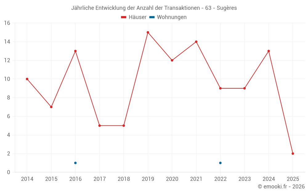 Der Durchschnittspreis auf den 19 Hausgeschäften der letzten 24 Monate in der Gemeinde Sugères betrug 1 355 € pro Quadratmeter für einen mittleren Immobilienwert von 106 000 €. Über diesen Zeitraum hinweg lagen 60% der Transaktionen zwischen 953 und 1 772 € pro Quadratmeter (vom 2. bis zum 8. Dezil).