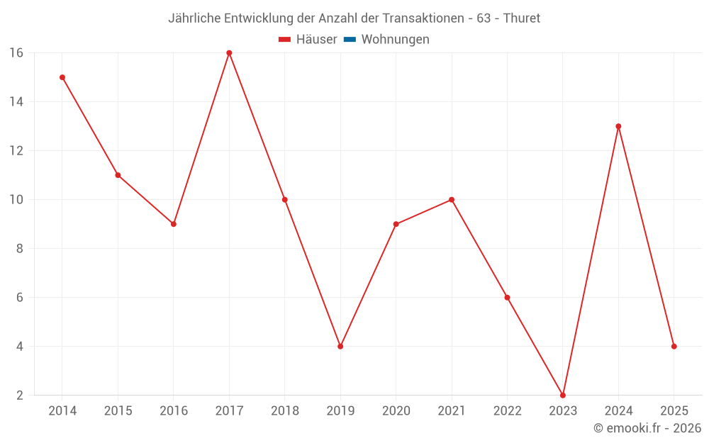 Der Durchschnittspreis auf den 19 Hausgeschäften der letzten 24 Monate in der Gemeinde Thuret betrug 1 752 € pro Quadratmeter für einen mittleren Immobilienwert von 178 600 €. Über diesen Zeitraum hinweg lagen 60% der Transaktionen zwischen 1 146 und 2 275 € pro Quadratmeter (vom 2. bis zum 8. Dezil).