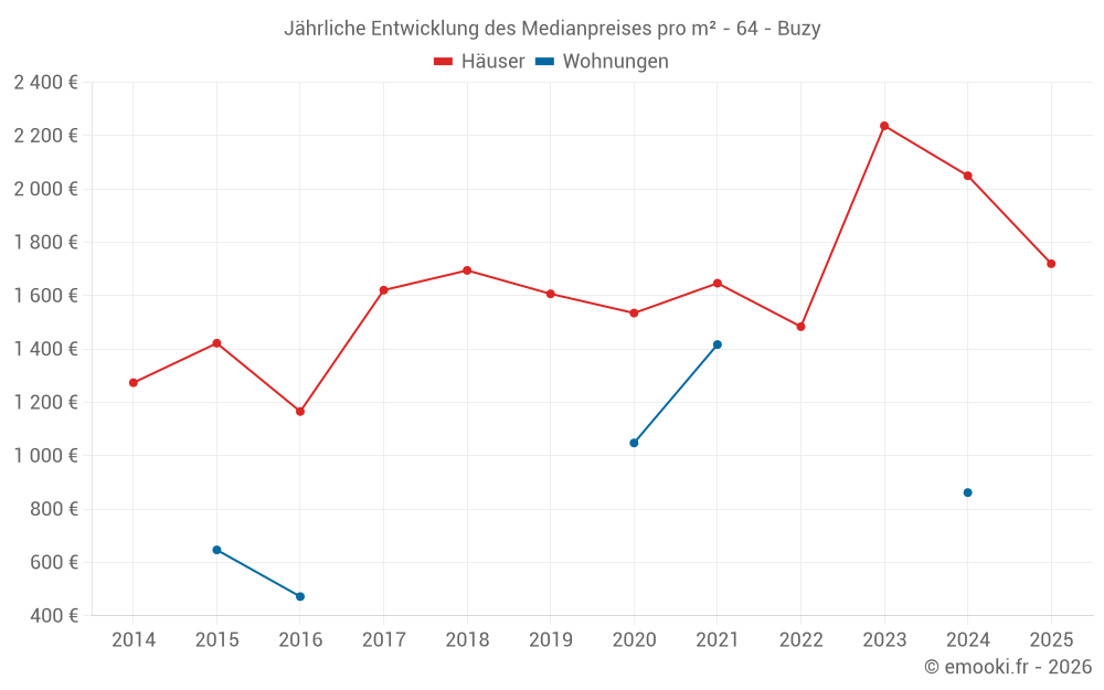 Der Durchschnittspreis auf den 21 Hausgeschäften der letzten 24 Monate in der Gemeinde Buzy betrug 2 008 € pro Quadratmeter für einen mittleren Immobilienwert von 179 000 €. Über diesen Zeitraum hinweg lagen 60% der Transaktionen zwischen 1 348 und 2 482 € pro Quadratmeter (vom 2. bis zum 8. Dezil).