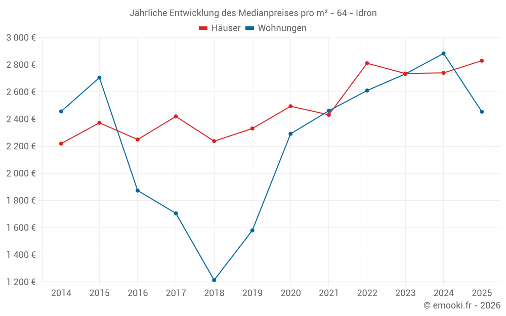 Der Durchschnittspreis auf den 18 Wohnungstransaktionen der letzten 12 Monate in der Gemeinde Idron betrug 2 702 € pro Quadratmeter für einen mittleren Immobilienwert von 135 500 €. Über diesen Zeitraum hinweg lagen 60% der Transaktionen zwischen 2 400 und 3 017 € pro Quadratmeter (vom 2. bis zum 8. Dezil).