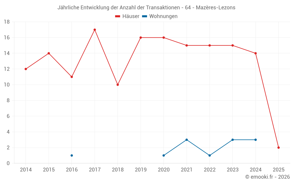 Der Durchschnittspreis auf den 19 Hausgeschäften der letzten 24 Monate in der Gemeinde Mazères-Lezons betrug 2 372 € pro Quadratmeter für einen mittleren Immobilienwert von 200 000 €. Über diesen Zeitraum hinweg lagen 60% der Transaktionen zwischen 1 892 und 2 563 € pro Quadratmeter (vom 2. bis zum 8. Dezil).
