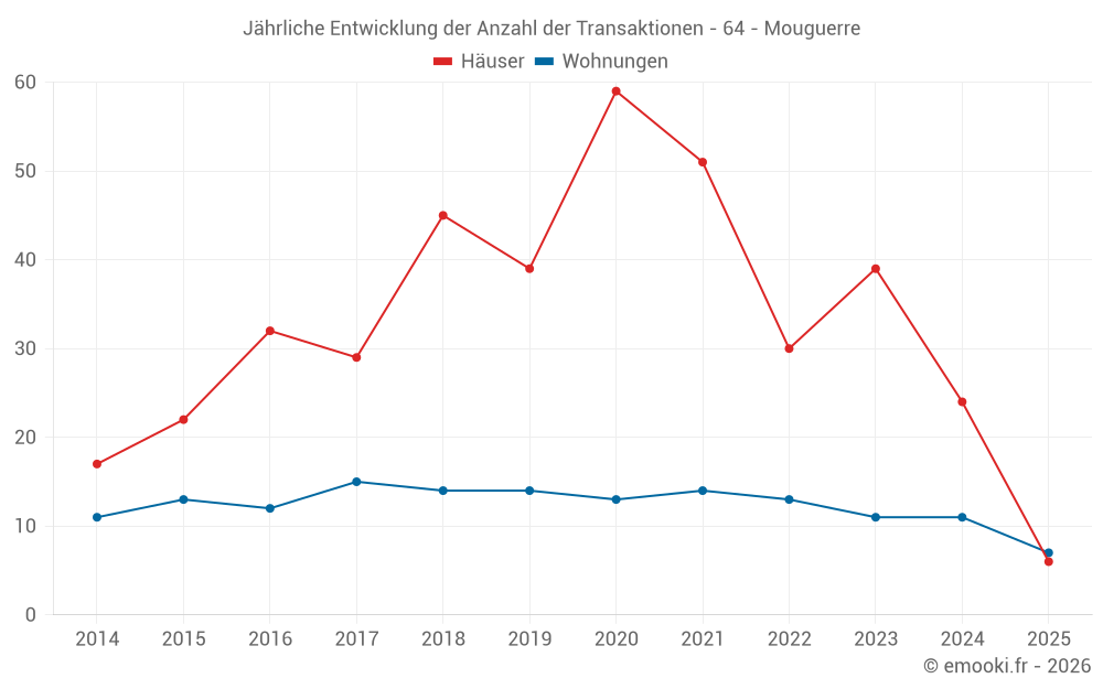 Der Durchschnittspreis auf den 24 Hausgeschäften der letzten 12 Monate in der Gemeinde Mouguerre betrug 4 010 € pro Quadratmeter für einen mittleren Immobilienwert von 485 500 €. Über diesen Zeitraum hinweg lagen 60% der Transaktionen zwischen 2 991 und 4 992 € pro Quadratmeter (vom 2. bis zum 8. Dezil).