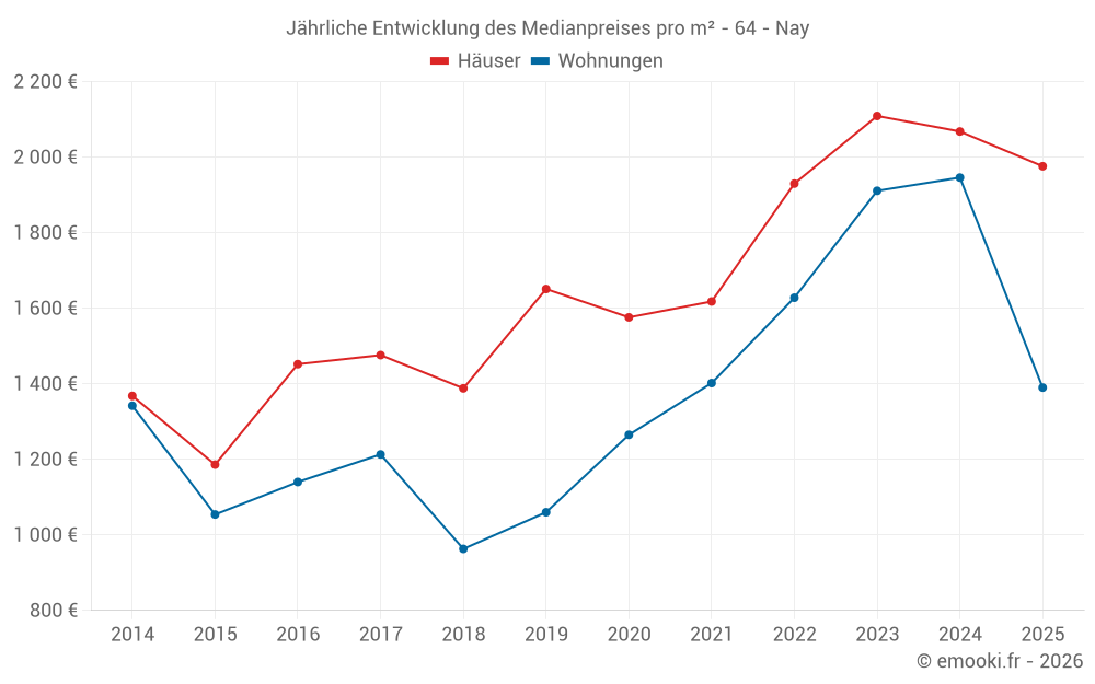 Der Durchschnittspreis auf den 25 Hausgeschäften der letzten 12 Monate in der Gemeinde Nay betrug 1 976 € pro Quadratmeter für einen mittleren Immobilienwert von 228 600 €. Über diesen Zeitraum hinweg lagen 60% der Transaktionen zwischen 1 464 und 2 909 € pro Quadratmeter (vom 2. bis zum 8. Dezil).