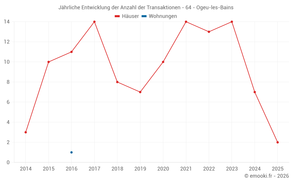 Der Durchschnittspreis auf den 16 Hausgeschäften der letzten 24 Monate in der Gemeinde Ogeu-les-Bains betrug 1 768 € pro Quadratmeter für einen mittleren Immobilienwert von 141 403 €. Über diesen Zeitraum hinweg lagen 60% der Transaktionen zwischen 1 025 und 2 333 € pro Quadratmeter (vom 2. bis zum 8. Dezil).