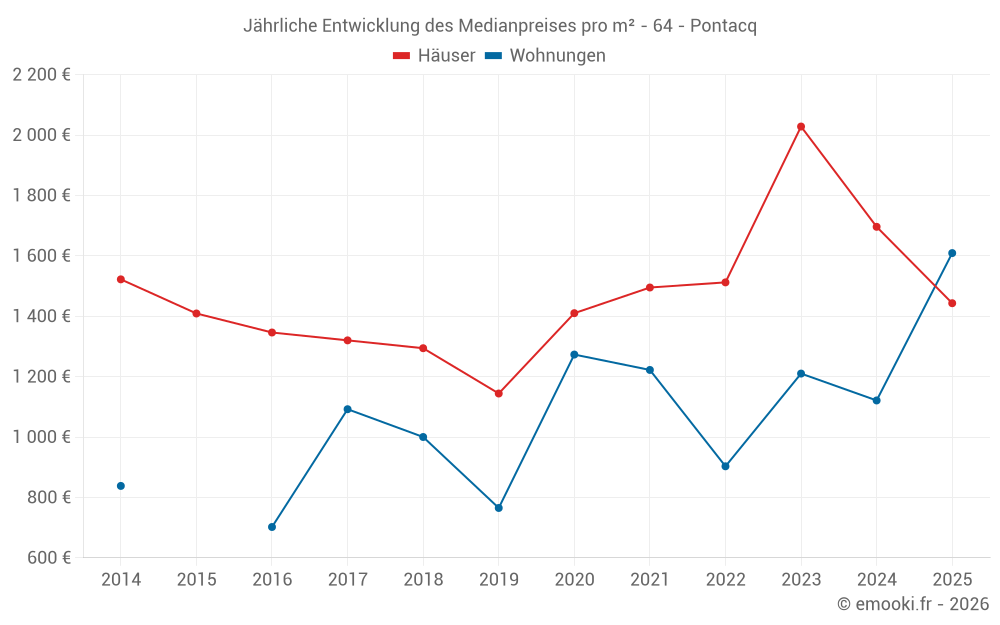 Der Durchschnittspreis auf den 21 Hausgeschäften der letzten 12 Monate in der Gemeinde Pontacq betrug 1 619 € pro Quadratmeter für einen mittleren Immobilienwert von 218 500 €. Über diesen Zeitraum hinweg lagen 60% der Transaktionen zwischen 1 309 und 2 231 € pro Quadratmeter (vom 2. bis zum 8. Dezil).