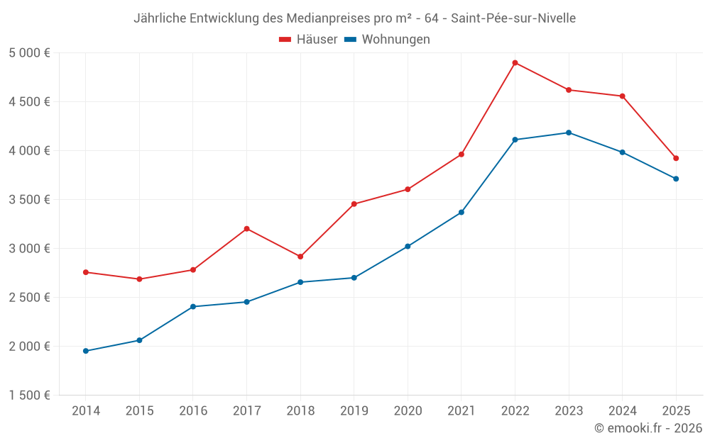 Der Durchschnittspreis auf den 25 Wohnungstransaktionen der letzten 12 Monate in der Gemeinde Saint-Pée-sur-Nivelle betrug 3 944 € pro Quadratmeter für einen mittleren Immobilienwert von 230 000 €. Über diesen Zeitraum hinweg lagen 60% der Transaktionen zwischen 3 389 und 4 161 € pro Quadratmeter (vom 2. bis zum 8. Dezil).