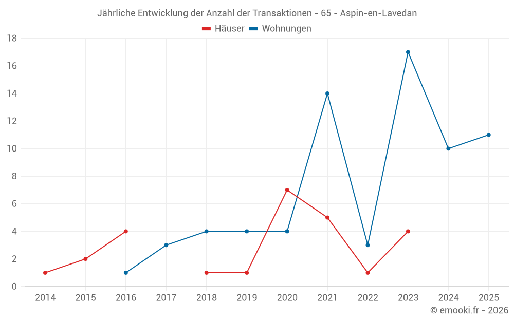 Der Durchschnittspreis auf den 26 Wohnungstransaktionen der letzten 24 Monate in der Gemeinde Aspin-en-Lavedan betrug 1 110 € pro Quadratmeter für einen mittleren Immobilienwert von 34 000 €. Über diesen Zeitraum hinweg lagen 60% der Transaktionen zwischen 906 und 1 364 € pro Quadratmeter (vom 2. bis zum 8. Dezil).