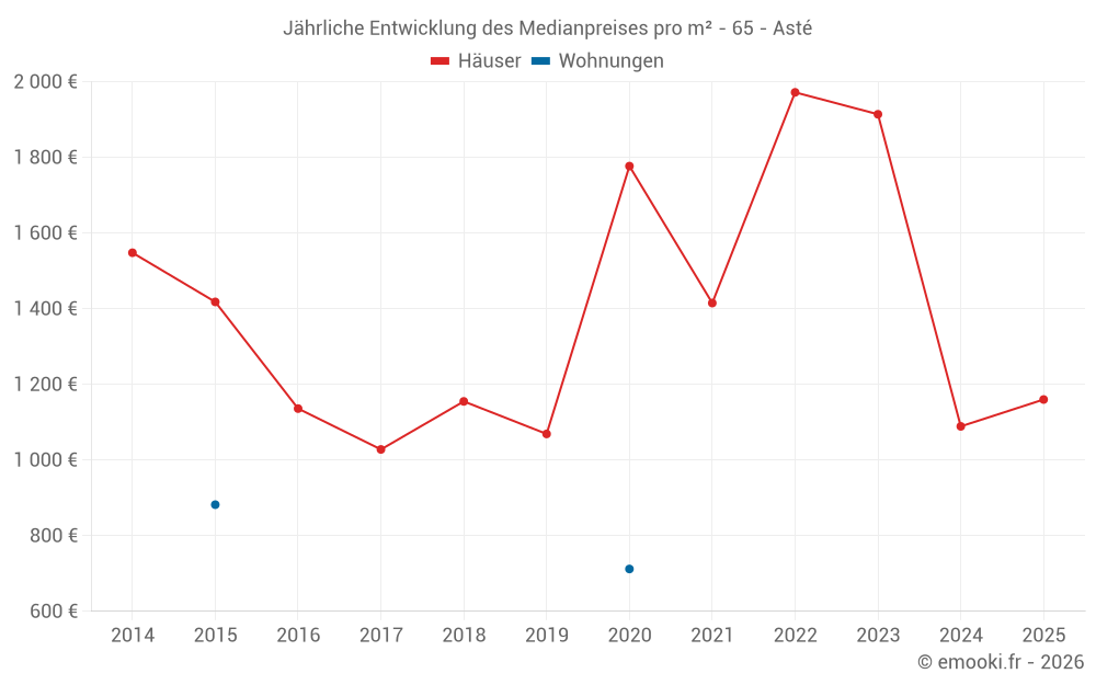 Der Durchschnittspreis auf den 19 Hausgeschäften der letzten 24 Monate in der Gemeinde Asté betrug 1 160 € pro Quadratmeter für einen mittleren Immobilienwert von 129 000 €. Über diesen Zeitraum hinweg lagen 60% der Transaktionen zwischen 944 und 2 173 € pro Quadratmeter (vom 2. bis zum 8. Dezil).