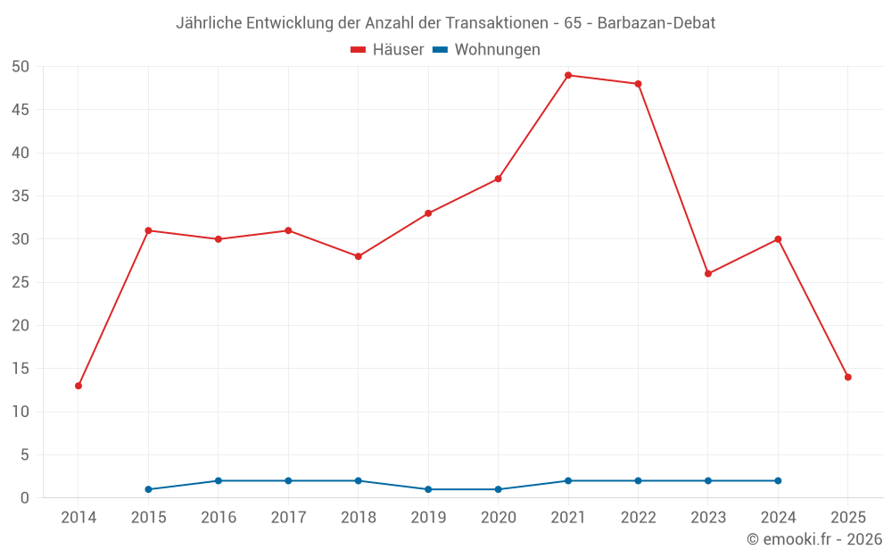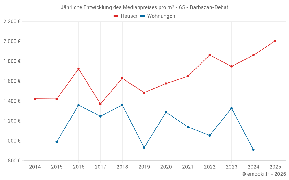 Der Durchschnittspreis auf den 29 Hausgeschäften der letzten 12 Monate in der Gemeinde Barbazan-Debat betrug 1 882 € pro Quadratmeter für einen mittleren Immobilienwert von 190 000 €. Über diesen Zeitraum hinweg lagen 60% der Transaktionen zwischen 1 319 und 2 375 € pro Quadratmeter (vom 2. bis zum 8. Dezil).