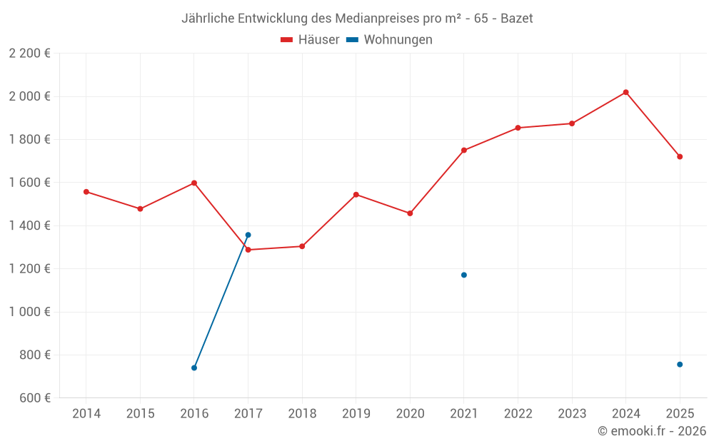 Der Durchschnittspreis auf den 33 Hausgeschäften der letzten 24 Monate in der Gemeinde Bazet betrug 1 641 € pro Quadratmeter für einen mittleren Immobilienwert von 169 014 €. Über diesen Zeitraum hinweg lagen 60% der Transaktionen zwischen 1 060 und 2 136 € pro Quadratmeter (vom 2. bis zum 8. Dezil).
