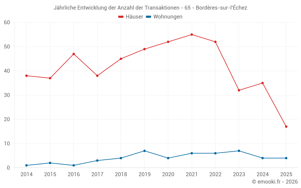 Der Durchschnittspreis auf den 41 Hausgeschäften der letzten 12 Monate in der Gemeinde Bordères-sur-l'Échez betrug 1 859 € pro Quadratmeter für einen mittleren Immobilienwert von 193 900 €. Über diesen Zeitraum hinweg lagen 60% der Transaktionen zwischen 1 243 und 2 242 € pro Quadratmeter (vom 2. bis zum 8. Dezil).