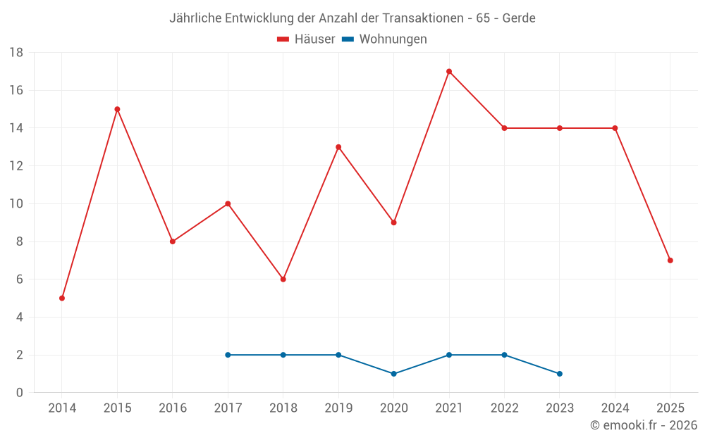 Der Durchschnittspreis auf den 28 Hausgeschäften der letzten 24 Monate in der Gemeinde Gerde betrug 1 896 € pro Quadratmeter für einen mittleren Immobilienwert von 205 762 €. Über diesen Zeitraum hinweg lagen 60% der Transaktionen zwischen 1 451 und 2 599 € pro Quadratmeter (vom 2. bis zum 8. Dezil).