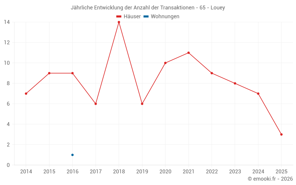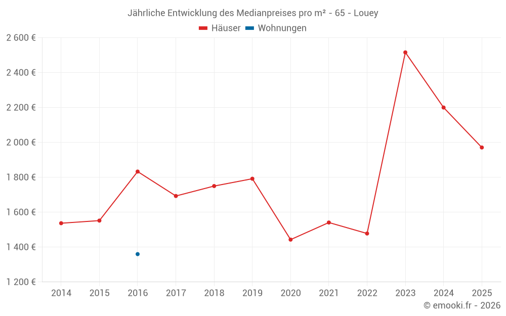 Der Durchschnittspreis auf den 16 Hausgeschäften der letzten 24 Monate in der Gemeinde Louey betrug 2 107 € pro Quadratmeter für einen mittleren Immobilienwert von 238 275 €. Über diesen Zeitraum hinweg lagen 60% der Transaktionen zwischen 1 408 und 2 677 € pro Quadratmeter (vom 2. bis zum 8. Dezil).