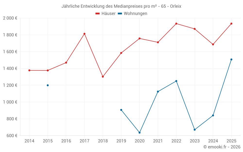 Der Durchschnittspreis auf den 22 Hausgeschäften der letzten 12 Monate in der Gemeinde Orleix betrug 1 870 € pro Quadratmeter für einen mittleren Immobilienwert von 185 945 €. Über diesen Zeitraum hinweg lagen 60% der Transaktionen zwischen 1 572 und 2 138 € pro Quadratmeter (vom 2. bis zum 8. Dezil).