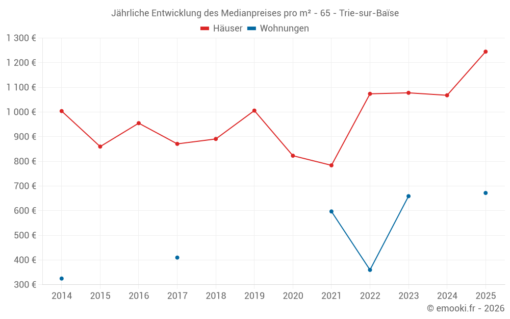 Der Durchschnittspreis auf den 19 Hausgeschäften der letzten 12 Monate in der Gemeinde Trie-sur-Baïse betrug 1 098 € pro Quadratmeter für einen mittleren Immobilienwert von 140 000 €. Über diesen Zeitraum hinweg lagen 60% der Transaktionen zwischen 843 und 1 490 € pro Quadratmeter (vom 2. bis zum 8. Dezil).