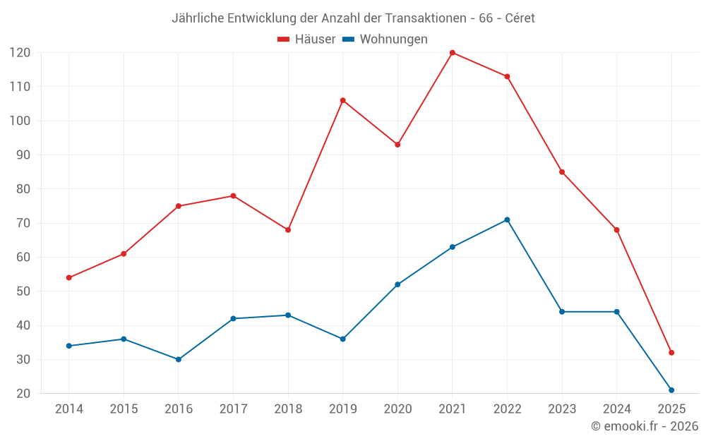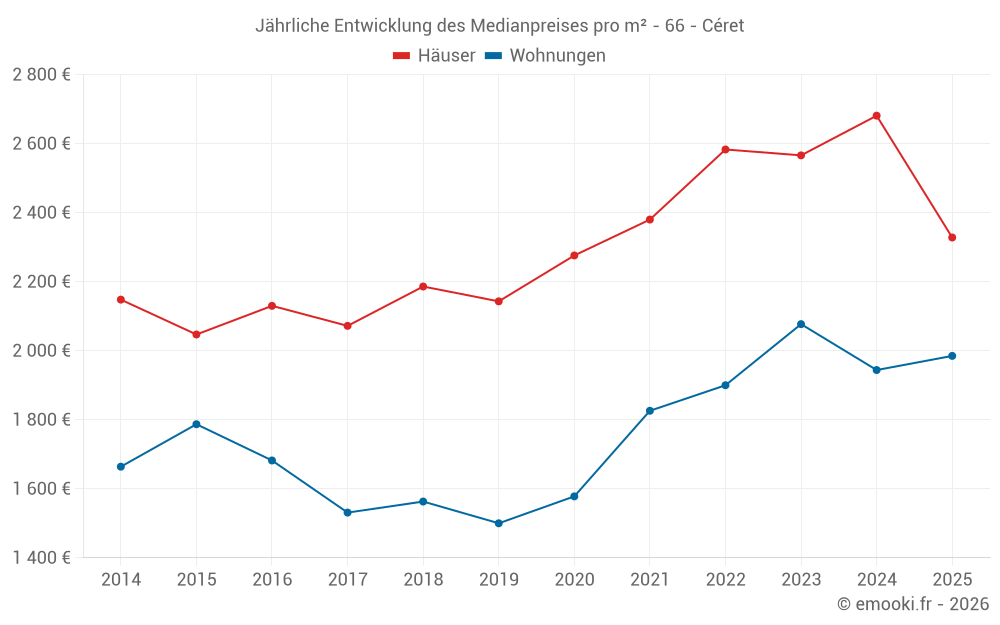 Der Durchschnittspreis auf den 32 Hausgeschäften der letzten 6 Monate in der Gemeinde Céret betrug 2 328 € pro Quadratmeter für einen mittleren Immobilienwert von 244 308 €. Über diesen Zeitraum hinweg lagen 60% der Transaktionen zwischen 1 782 und 3 411 € pro Quadratmeter (vom 2. bis zum 8. Dezil).