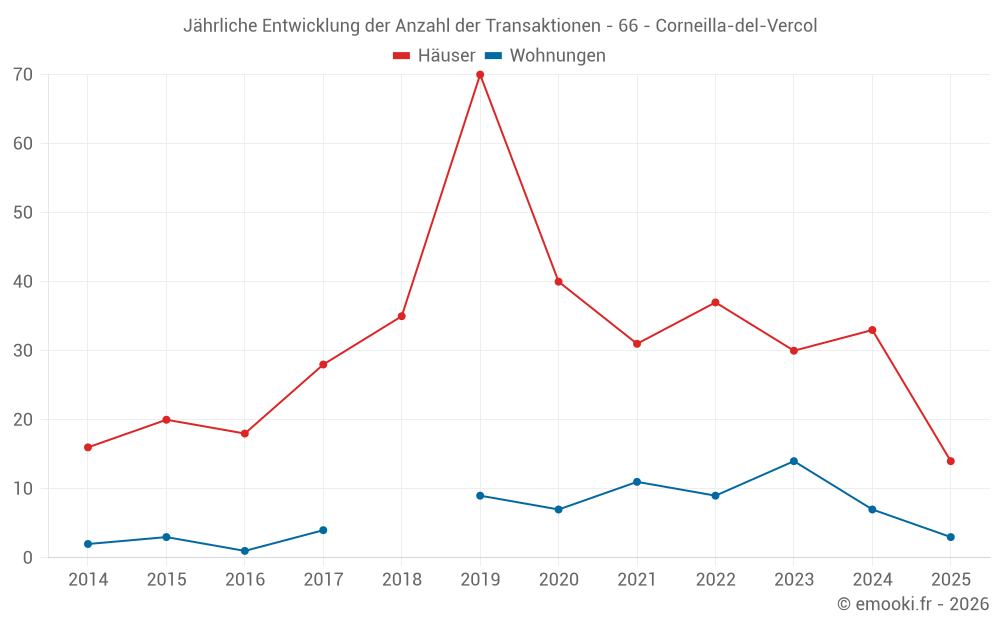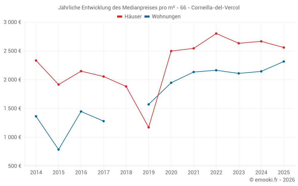 Der Durchschnittspreis auf den 35 Hausgeschäften der letzten 12 Monate in der Gemeinde Corneilla-del-Vercol betrug 2 591 € pro Quadratmeter für einen mittleren Immobilienwert von 257 000 €. Über diesen Zeitraum hinweg lagen 60% der Transaktionen zwischen 2 153 und 3 283 € pro Quadratmeter (vom 2. bis zum 8. Dezil).