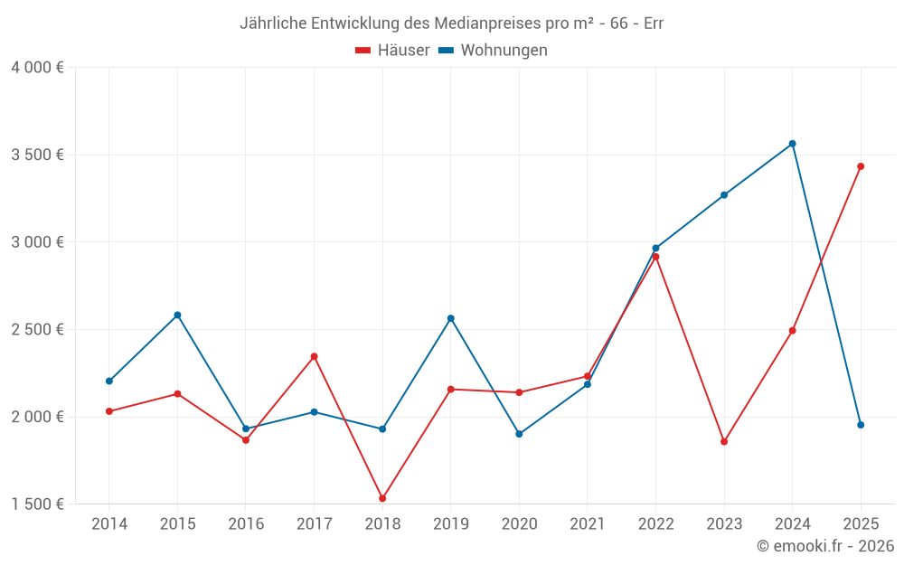 Der Durchschnittspreis auf den 16 Hausgeschäften der letzten 24 Monate in der Gemeinde Err betrug 2 828 € pro Quadratmeter für einen mittleren Immobilienwert von 264 205 €. Über diesen Zeitraum hinweg lagen 60% der Transaktionen zwischen 1 733 und 3 434 € pro Quadratmeter (vom 2. bis zum 8. Dezil).