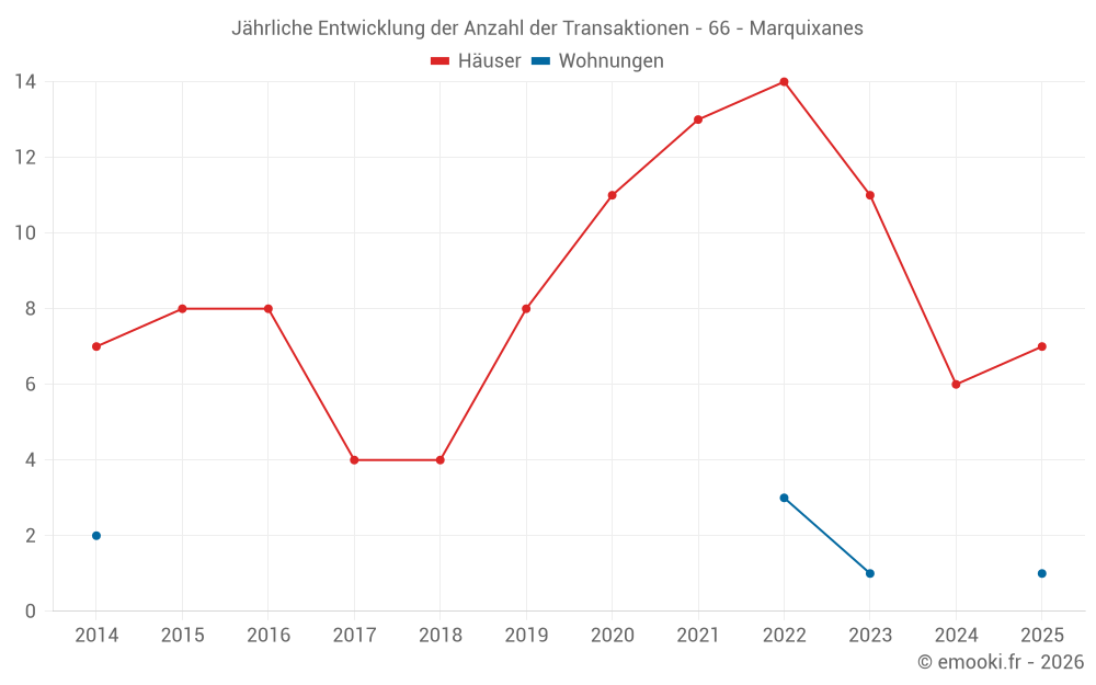 Der Durchschnittspreis auf den 17 Hausgeschäften der letzten 24 Monate in der Gemeinde Marquixanes betrug 1 585 € pro Quadratmeter für einen mittleren Immobilienwert von 120 000 €. Über diesen Zeitraum hinweg lagen 60% der Transaktionen zwischen 836 und 2 270 € pro Quadratmeter (vom 2. bis zum 8. Dezil).