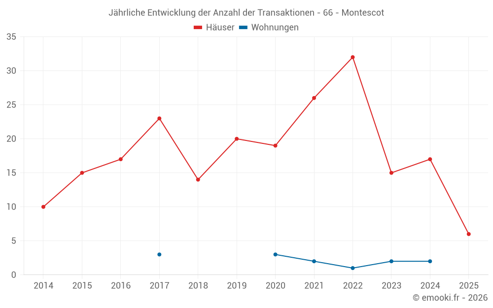 Der Durchschnittspreis auf den 16 Hausgeschäften der letzten 12 Monate in der Gemeinde Montescot betrug 2 848 € pro Quadratmeter für einen mittleren Immobilienwert von 272 815 €. Über diesen Zeitraum hinweg lagen 60% der Transaktionen zwischen 2 542 und 3 226 € pro Quadratmeter (vom 2. bis zum 8. Dezil).