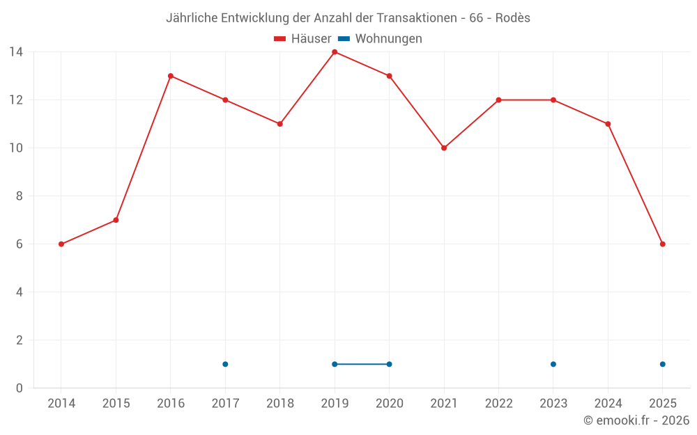 Der Durchschnittspreis auf den 16 Hausgeschäften der letzten 12 Monate in der Gemeinde Rodès betrug 1 868 € pro Quadratmeter für einen mittleren Immobilienwert von 154 000 €. Über diesen Zeitraum hinweg lagen 60% der Transaktionen zwischen 1 203 und 2 229 € pro Quadratmeter (vom 2. bis zum 8. Dezil).