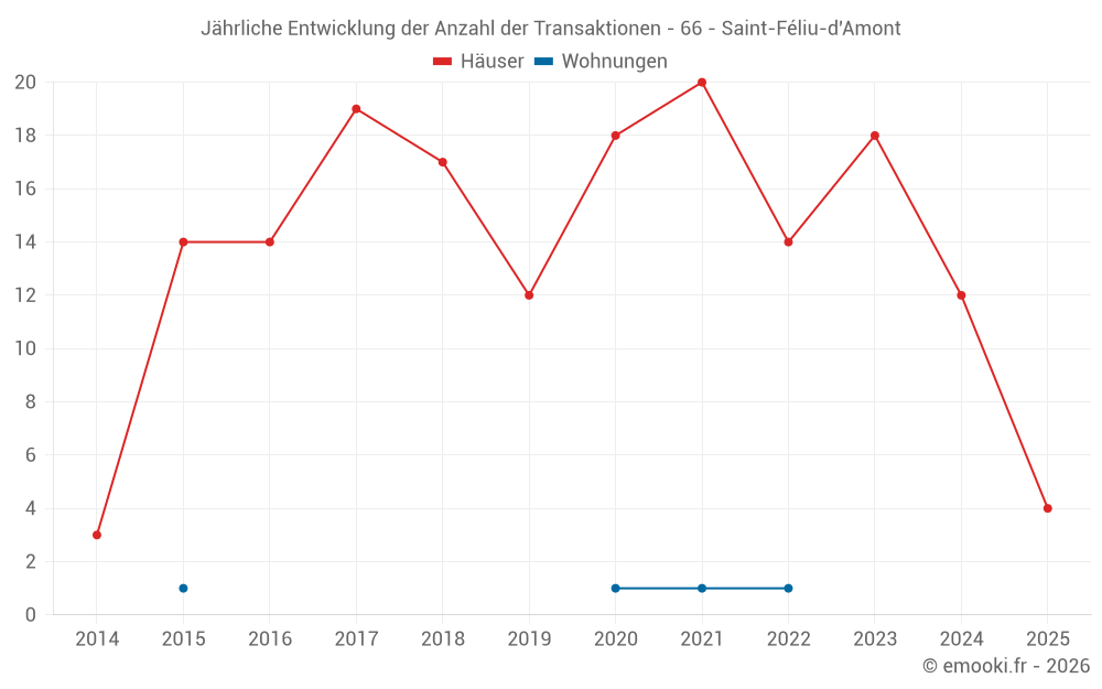 Der Durchschnittspreis auf den 23 Hausgeschäften der letzten 24 Monate in der Gemeinde Saint-Féliu-d'Amont betrug 2 420 € pro Quadratmeter für einen mittleren Immobilienwert von 220 000 €. Über diesen Zeitraum hinweg lagen 60% der Transaktionen zwischen 1 901 und 2 848 € pro Quadratmeter (vom 2. bis zum 8. Dezil).
