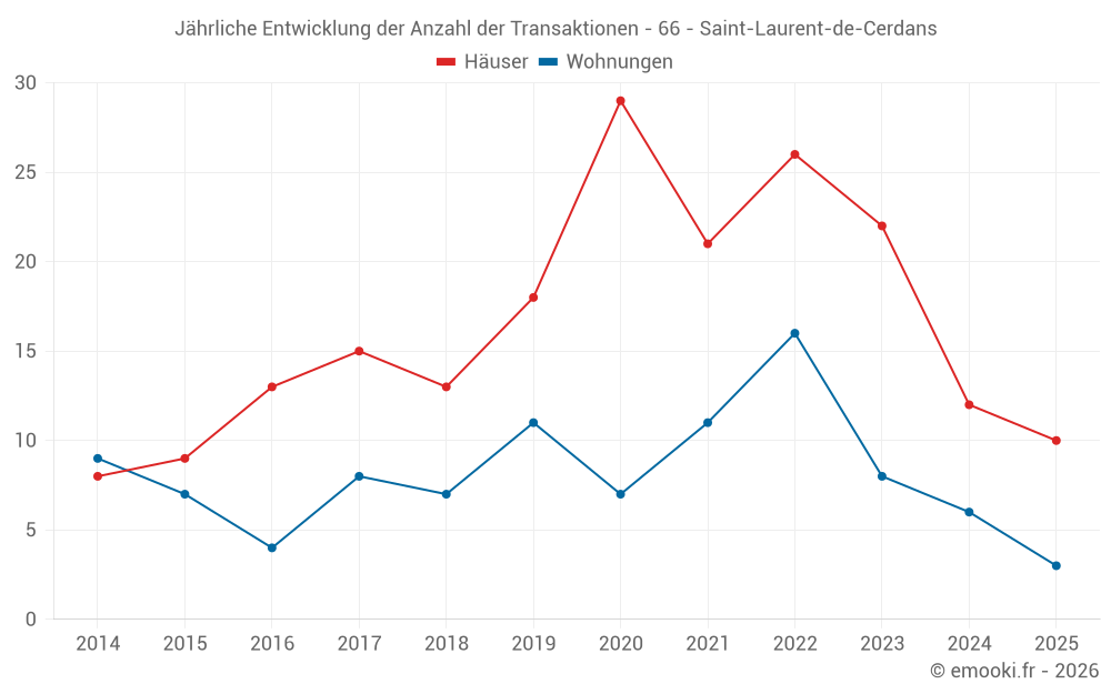 Der Durchschnittspreis auf den 18 Hausgeschäften der letzten 12 Monate in der Gemeinde Saint-Laurent-de-Cerdans betrug 1 312 € pro Quadratmeter für einen mittleren Immobilienwert von 90 660 €. Über diesen Zeitraum hinweg lagen 60% der Transaktionen zwischen 724 und 1 892 € pro Quadratmeter (vom 2. bis zum 8. Dezil).