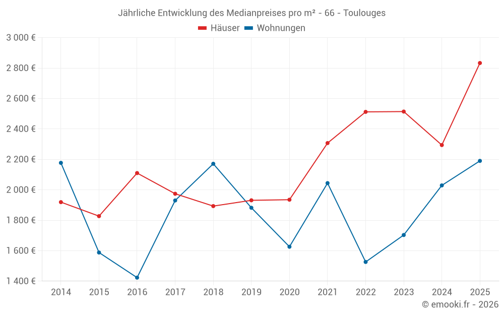 Der Durchschnittspreis auf den 23 Hausgeschäften der letzten 6 Monate in der Gemeinde Toulouges betrug 2 833 € pro Quadratmeter für einen mittleren Immobilienwert von 260 000 €. Über diesen Zeitraum hinweg lagen 60% der Transaktionen zwischen 1 648 und 3 254 € pro Quadratmeter (vom 2. bis zum 8. Dezil).