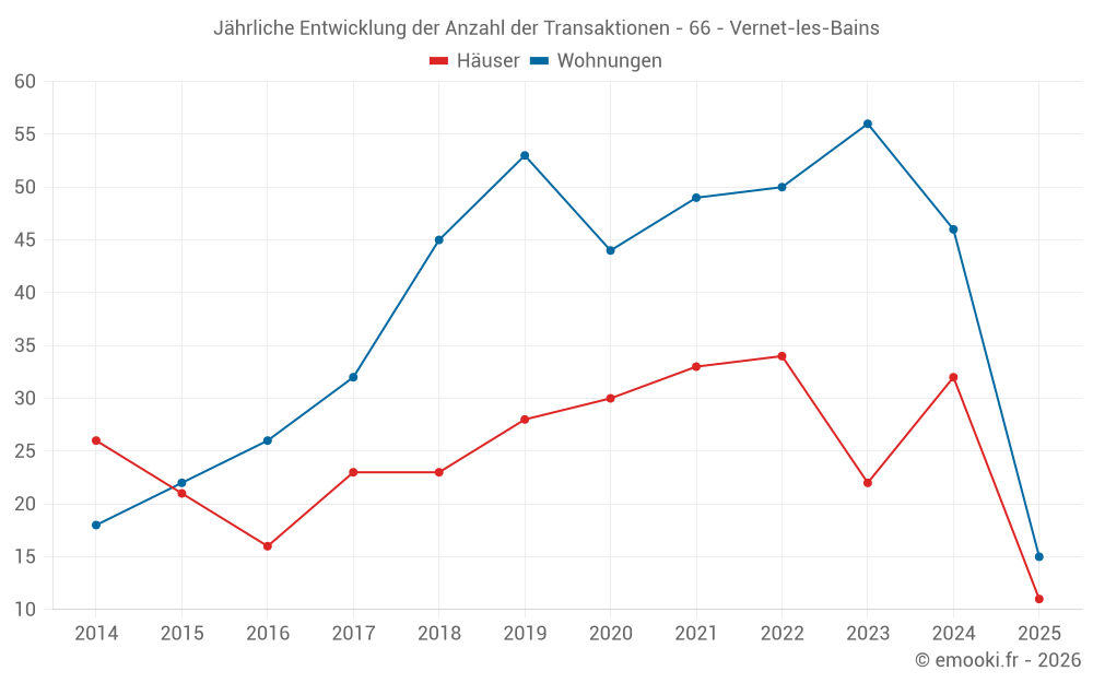 Der Durchschnittspreis auf den 39 Wohnungstransaktionen der letzten 12 Monate in der Gemeinde Vernet-les-Bains betrug 1 325 € pro Quadratmeter für einen mittleren Immobilienwert von 56 500 €. Über diesen Zeitraum hinweg lagen 60% der Transaktionen zwischen 1 069 und 1 595 € pro Quadratmeter (vom 2. bis zum 8. Dezil).