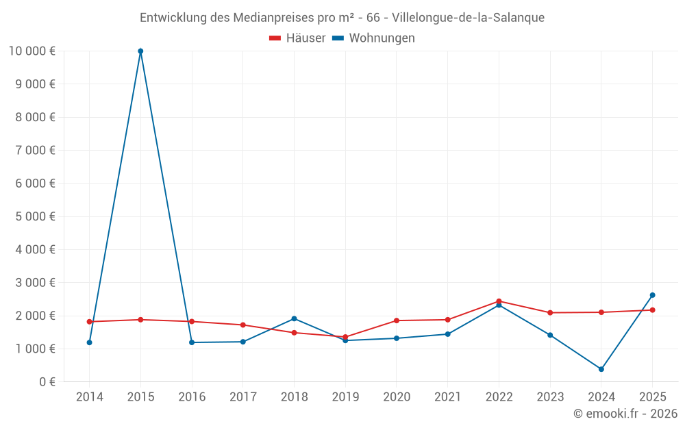 Der Durchschnittspreis auf den 36 Hausgeschäften der letzten 12 Monate in der Gemeinde Villelongue-de-la-Salanque betrug 2 106 € pro Quadratmeter für einen mittleren Immobilienwert von 151 500 €. Über diesen Zeitraum hinweg lagen 60% der Transaktionen zwischen 1 627 und 2 607 € pro Quadratmeter (vom 2. bis zum 8. Dezil).