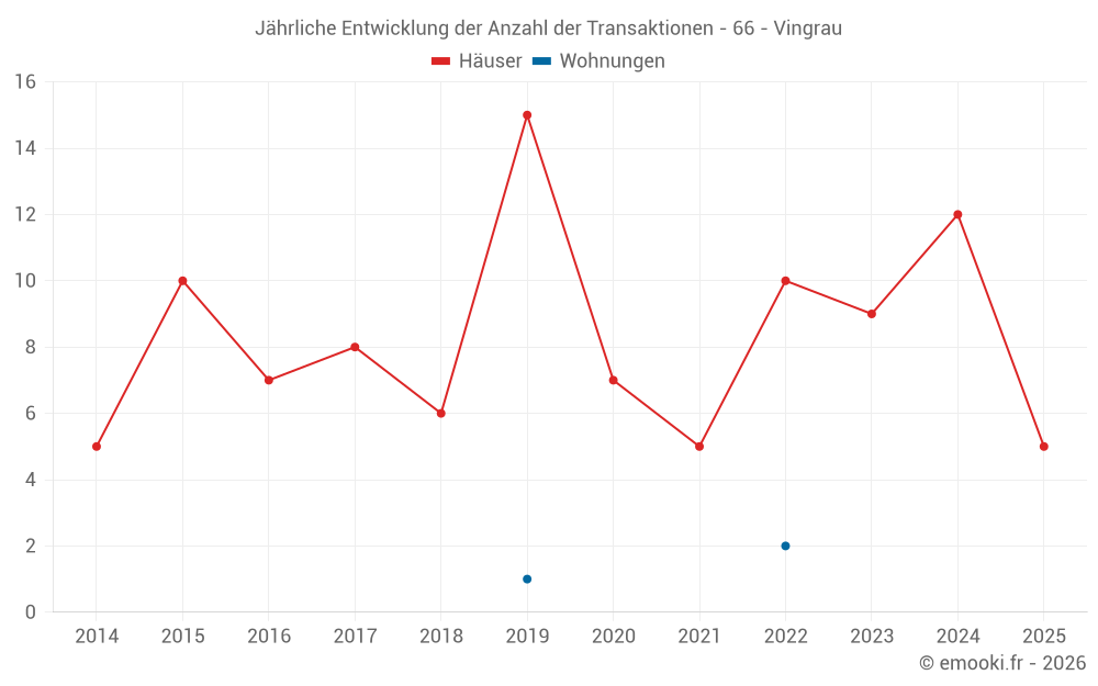 Der Durchschnittspreis auf den 23 Hausgeschäften der letzten 24 Monate in der Gemeinde Vingrau betrug 1 281 € pro Quadratmeter für einen mittleren Immobilienwert von 110 000 €. Über diesen Zeitraum hinweg lagen 60% der Transaktionen zwischen 915 und 2 515 € pro Quadratmeter (vom 2. bis zum 8. Dezil).