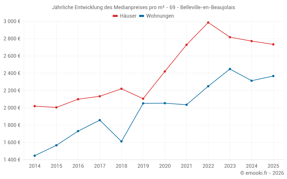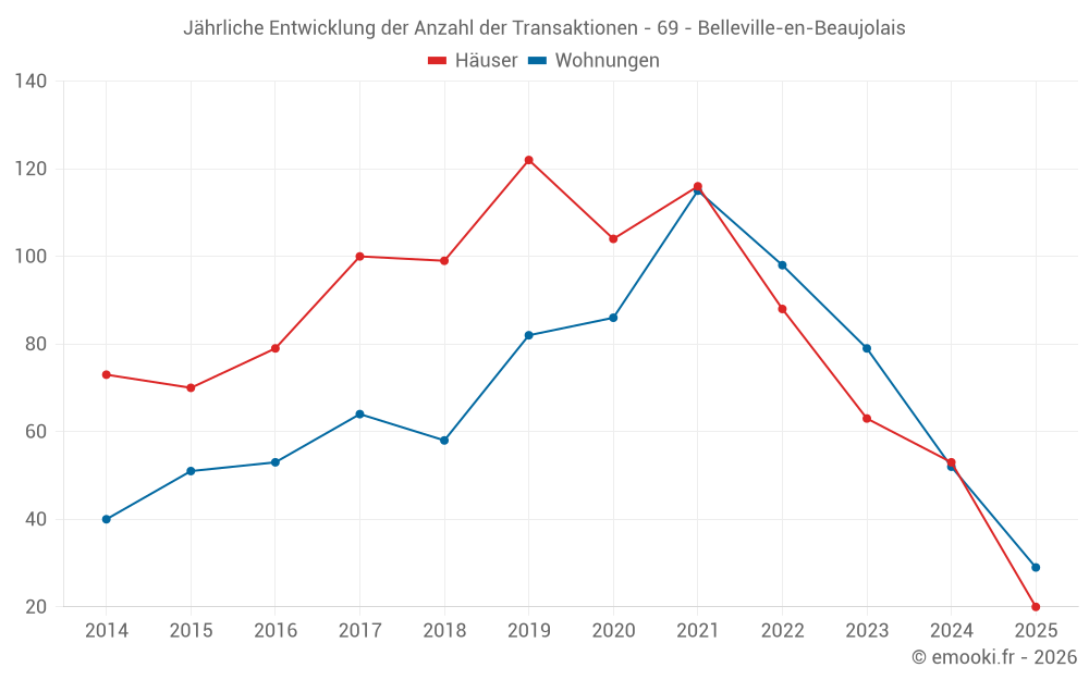 Der Durchschnittspreis auf den 20 Hausgeschäften der letzten 6 Monate in der Gemeinde Belleville-en-Beaujolais betrug 2 734 € pro Quadratmeter für einen mittleren Immobilienwert von 241 250 €. Über diesen Zeitraum hinweg lagen 60% der Transaktionen zwischen 2 345 und 3 111 € pro Quadratmeter (vom 2. bis zum 8. Dezil).