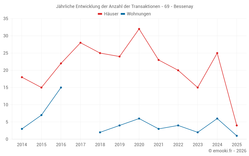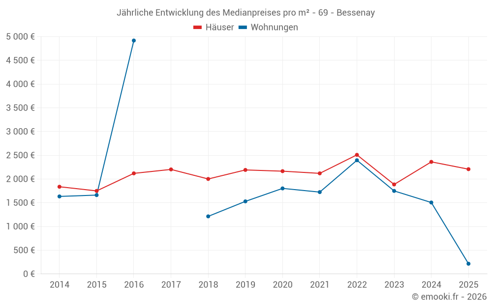 Der Durchschnittspreis auf den 22 Hausgeschäften der letzten 12 Monate in der Gemeinde Bessenay betrug 2 289 € pro Quadratmeter für einen mittleren Immobilienwert von 187 500 €. Über diesen Zeitraum hinweg lagen 60% der Transaktionen zwischen 1 744 und 3 150 € pro Quadratmeter (vom 2. bis zum 8. Dezil).